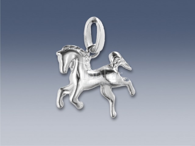 Stříbrný přívěsek ve tvaru koníka. Přívěsek je vyroben ze stříbra ryzosti 925/1000 a povrchově upraven vrstvou rhodia, které dodává šperku vysoký lesk a zvyšuje jeho odolnost.